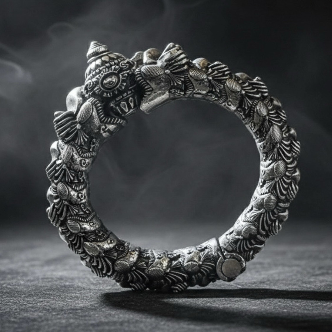 Antique Damru Bracelet — Handcrafted Real Silver Oxidised Mens Bracelet | Original iJewellery.in Design | 85g