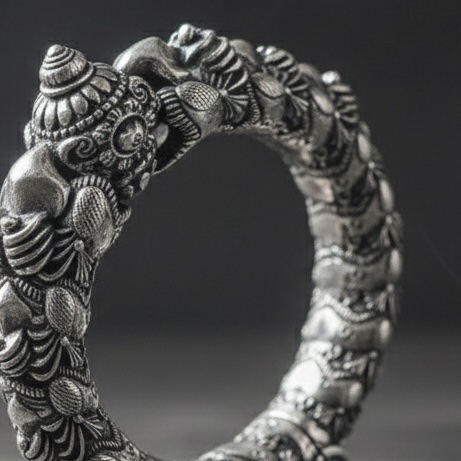 • Theme: Antique oxidised silver — Temple & rhythm motif.
